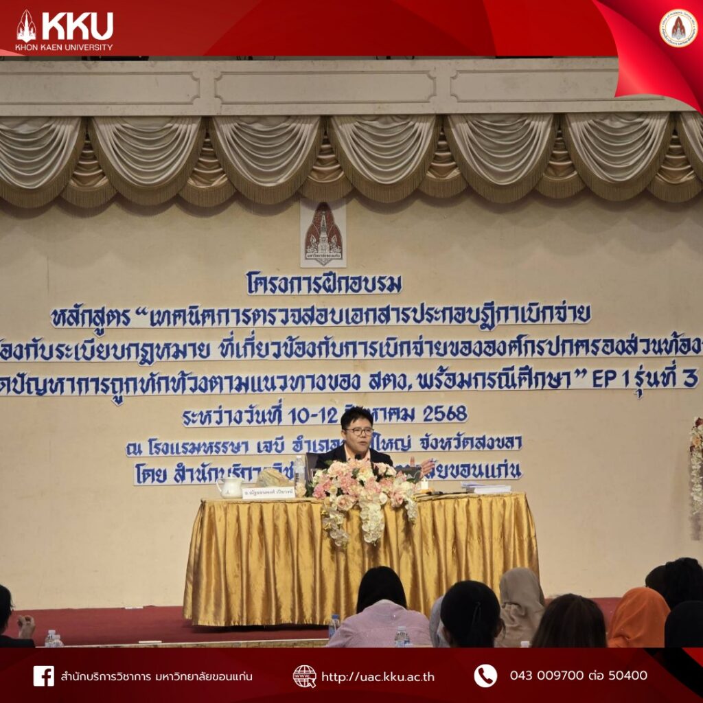 สำนักบริการวิชาการ มหาวิทยาลัยขอนแก่น จัดโครงการฝึกอบรมเชิงปฏิบัติการหลักสูตรการจัดการศึกษาตลอดชีวิต “เทคนิคการตรวจสอบเอกสารประกอบฎีกาเบิกจ่ายที่สอดคล้องกับระเบียบกฎหมาย ที่เกี่ยวข้องกับการเบิกจ่ายขององค์กรปกครองส่วนท้องถิ่น เพื่อลดปัญหาการถูกทักท้วงตามแนวทางของ สตง. พร้อมกรณีศึกษา” ระหว่างวันที่ 10-12 สิงหาคม 2568 ณ โรงแรมหรรษาเจบี จังหวัดสงขลา