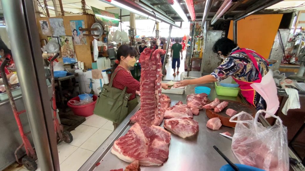 “สำหรับชิ้นส่วนหมูที่มีราคาสูงและขาดตลาดคือหมูสามชั้นและสันคอหมู ราคาจำหน่ายวันนี้ อยู่ที่ กก.ละ 210 บาท หมูเนื้อแดง กก.ละ 180 บาท โดยสาเหตุที่หมูราคาสูงขึ้นนั้นชัดเจนว่าเพราะน้ำมันแพงทำให้ค่าขนส่งมีต้นทุนสูงขึ้น เช่นเดียวกันกับอาหารสัตว์ที่มีการปรับราคาขึ้นเช่นกัน จึงทำให้ภาพรวมราคาหมู จึงต้องทยอยปรับราคาสูงขึ้นอีกครั้ง และ มีแนวโน้มราคาจะสูงขึ้นเพราะถ้าขึ้นแล้วจะลงยาก ซึ่งจากการปรับราคาขึ้นนั้นลูกค้าที่มาซื้อก็มีบ่นบ้าง และพฤติกรรมการซื้อเปลี่ยนไป คือซื้อน้อยลงชัดเจน บางรายก็หันไปรับประทานเนื้อสัตว์ประเภทอื่นแทน”