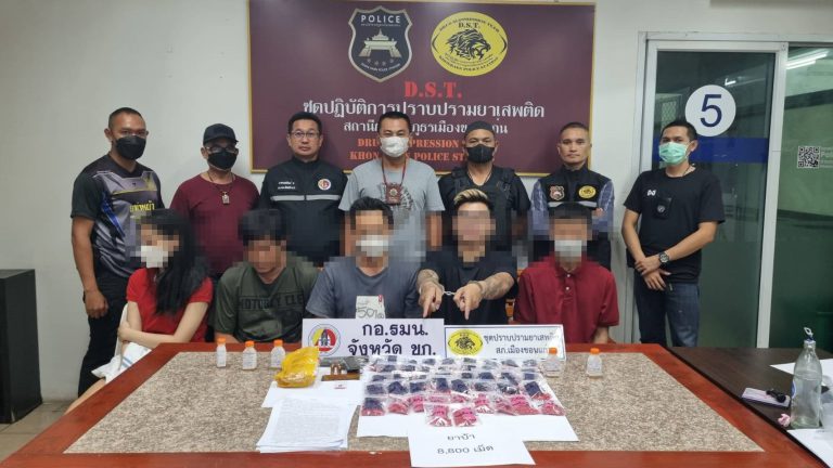 กอ.รมน.จังหวัดขอนแก่น บูรณาการร่วมกับตำรวจชุดปราบปรามยาเสพติด สภ.เมืองขอนแก่น, ตำรวจตรวจคนเข้าเมืองจังหวัดขอนแก่น ออกตรวจตราปัญหายาเสพติด และความสงบเรียบร้อย ภายในเขตอำเภอเมืองขอนแก่น ช่วงงานเทศกาลไหมนานาชาติ ประเพณีผูกเสี่ยวและงานกาชาด จังหวัดขอนแก่น จับกุมผู้ต้องหาจำนวน 5 คน พร้อมของกลางยาบ้ากว่า 8,800 เม็ด อาวุธปืน 1 กระบอก