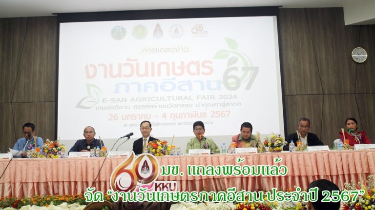 (มีคลิป)คณะเกษตรศาสตร์ มหาวิทยาลัยขอนแก่น จัดงานแถลงข่าว วันเกษตรภาคอีสาน ประจำปี 2568 “เกษตรอีสานสร้างสรรค์ ผลักดัน Soft Power ยกระดับเกษตรทันสมัย สู่การพัฒนาไทยให้ยั่งยืน” โดยมี รศ.นพ.ชาญชัย พานทองวิริยะกุล อธิการบดีมหาวิทยาลัยขอนแก่น นำ รศ.ดร.ดรุณี โชติษฐยางกูร คณบดีคณะเกษตรศาสตร์ ประธานคณะกรรมการจัดงาน และภาคีเครือข่าย ร่วมเปิดไฮไลต์มหกรรมสุดยิ่งใหญ่แห่งปี