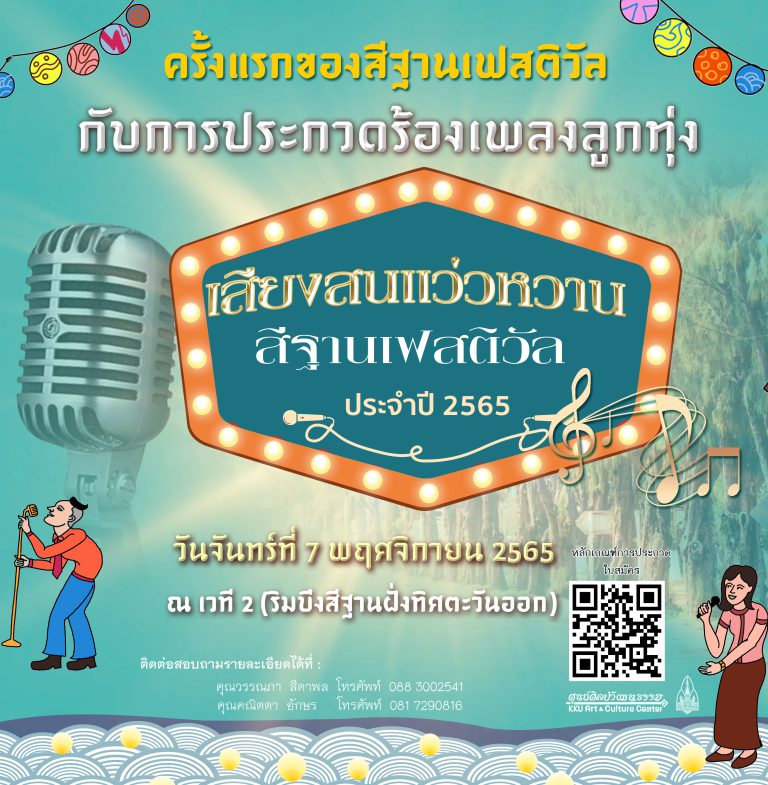 ด้วย มหาวิทยาลัยขอนแก่น กำหนดจัดการประกวดร้องเพลงลูกทุ่งเสียงสน แว่วหวาน สีฐานเฟสติวัล ประจำปี 2565 เพื่อเป็นการส่งเสริมและอนุรักษ์ศิลปะการแสดงของไทย ทั้งยังเป็นการส่งเสริมเยาวชนให้เกิดความภาคภูมิใจในมรดกทางวัฒนธรรม จึงได้กำหนดจัดกิจกรรมการประกวดรอบชิงชนะเลิศในวันจันทร์ ที่ 7 พฤศจิกายน 2565 ณ เวที 2 ริมบึงสีฐานฝั่งทิศตะวันออก มหาวิทยาลัยขอนแก่น นักเรียน นิสิต นักศึกษา และประชาชนทั่วไป อายุตั้งแ