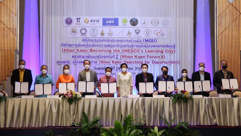 เมื่อเวลา 14.00 น. วันที่ 28 เม.ย. 2565 ที่โรงแรมพลูแมนขอนแก่น ราชาออคิด บริษัทขอนแก่นพัฒนาเมือง(เคเคทีที) จำกัด ร่วมกับภาคีเครือข่าย 10 หน่วยงาน ร่วมลงนามบันทึกข้อตกลงความร่วมมือการขับเคลื่อนขอนแก่นสู่การเป็นเมืองแห่งการเรียนรู้ มุ่งสู่ UNESCO ภายใต้การสนับสนุนจากหน่วยบริหารและจัดการทุนด้านการพัฒนาระดับพื้นที่ (บพท.) โดยมีคณะผู้บริหารจากหน่วยงานที่เกี่ยวข้อง ประกอบด้วย อบจ.ขอนแก่น , เทศบาลนครขอนแ