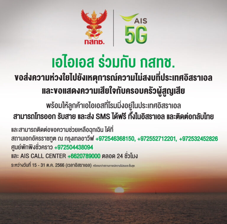 AIS พร้อมเชื่อมต่อระบบสื่อสาร สนับสนุนภารกิจช่วยเหลือคนไทย จากเหตุการณ์ความไม่สงบในประเทศอิสราเอล เพิ่มมาตรการอำนวยความสะดวกลูกค้าในการโทรและส่ง SMS ฟรี
