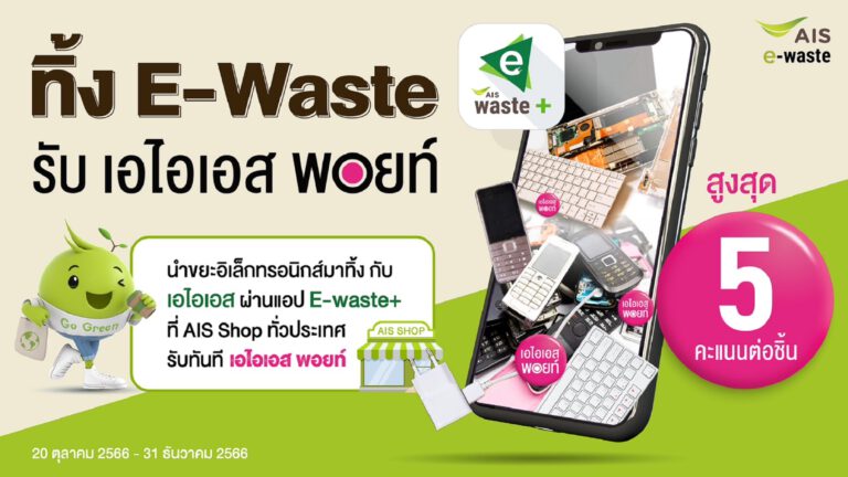 AISเดินหน้าเป้าหมายการเป็นศูนย์กลางด้านการจัดการขยะอิเล็กทรอนิกส์อัจฉริยะหรือHub of e-wasteอย่างต่อเนื่องล่าสุดเปิดตัวแคมเปญ“ทิ้งE-WasteรับAIS Points”ชวนลูกค้านำขยะอิเล็กทรอนิกส์ไม่ว่าจะเป็นโทรศัพท์มือถือแท็บเล็ตคอมพิวเตอร์โน๊ตบุ๊คอุปกรณ์เสริมมือถือชิ้นส่วนคอมพิวเตอร์และอุปกรณ์อิเล็กทรอนิกส์ขนาดเล็กมาทิ้งกับAISที่ศูนย์บริการAIS Shopที่ร่วมรายการผ่านแอปพลิเคชันE-Waste+แพลตฟอร์มการจัดการขยะอิเล็กทรอ